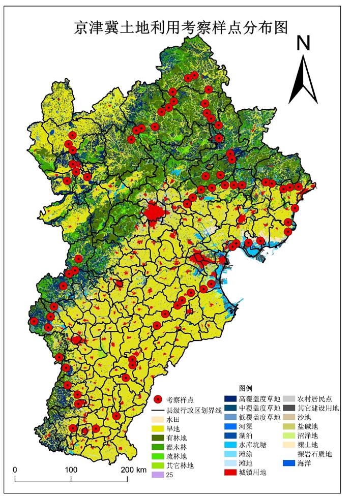 考察途经承德市--丰宁县--张北县--阜平县--井陉县--邯郸市--青县--秦皇岛等多个地点,选取了京津冀地区的主要土地利用/土地覆被类型进行实地调查和验证,包括林地、草地、耕地、水体、城乡居民用地。整个考察共选取了110个样本点。