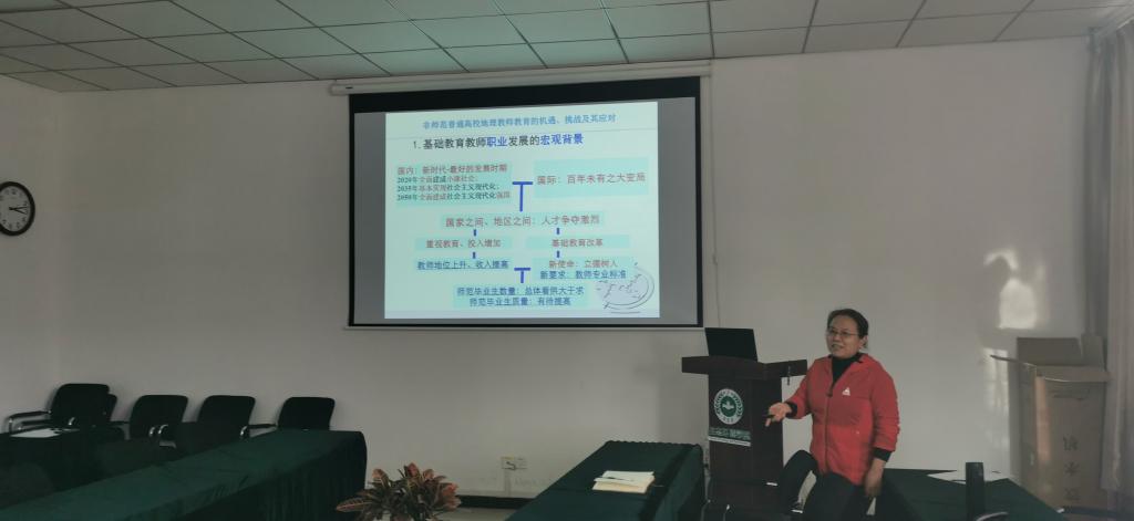 学术交流会上,地下水科学与工程教研室屈智慧老师、测绘工程教研室孙广通老师分别以《北京焦化厂原址污染场地修复工程案例分享》、《时序InSAR技术在高铁路基沉降监测中的应用研究》为题分享了自己的成功项目案例以及在研究过程中存在的问题做了总结和分析。与会教师从就自己感兴趣的话题与汇报者展开充分讨论,大家畅所欲言,气氛活跃。地理科学教研室刘巧芹老师以《非师范普通高校地理教师教育的机遇、挑战及其应对》为题就课堂教学和实际应用为例为在场教师分享教学经验。