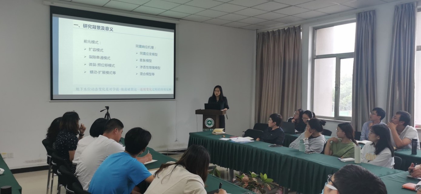 地下水科学与工程教研室的孔慧敏老师根据现阶段的研究成果形成“井水位震前-同震连续响应数值模拟初探”的报告题目,向在场师生介绍了基于线性孔弹性理论和流固耦合理论,构建井水位震前-同震连续响应数值模型的过程。