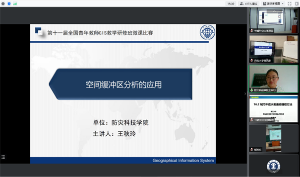 研讨班以专家授课为主,其中穿插学员微课比赛展示环节。参赛作品经过初选,共30位教师微课作品入围比赛复赛环节。公司王秋玲老师结合公司防震减灾救灾办学特色,以“空间缓冲区分析的应用”为题,在复赛中表现出色,荣获二等奖。