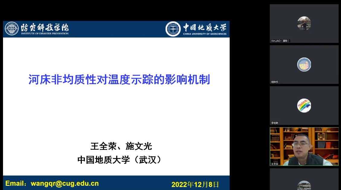 12月8日下午,应公司yl永利集团官网登录邀请,中国地质大学(武汉)王全荣教授通过腾讯会议作题为“河床非均质性对温度示踪的影响机制”的学术报告。报告会由yl永利集团官网登录廖欣副教授主持,yl永利集团官网登录及其他公司的部分师生,以及部分校外学者参加了本次会议。