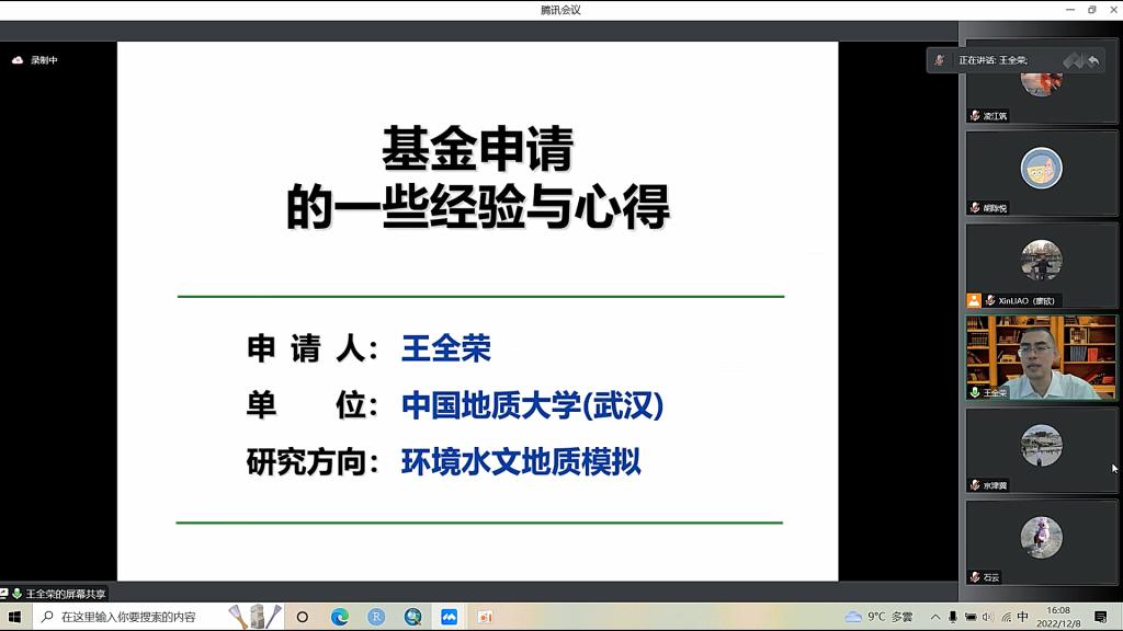 12月8日下午4:00,应公司yl永利集团官网登录邀请,中国地质大学(武汉)王全荣教授,通过腾讯会议作题为“基金申请的一些经验与心得”的线上交流报告。本次会议由永利集团官网廖欣副教授主持,yl永利集团官网登录与其他公司的部分教师参加了本次会议。