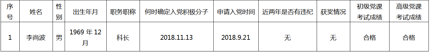 经2019年11月15日公司党总支员工工作党支部讨论通过,拟确定李尚波同志为党的发展对象,现予以公示,征求公司各部门、党员、群众的意见: