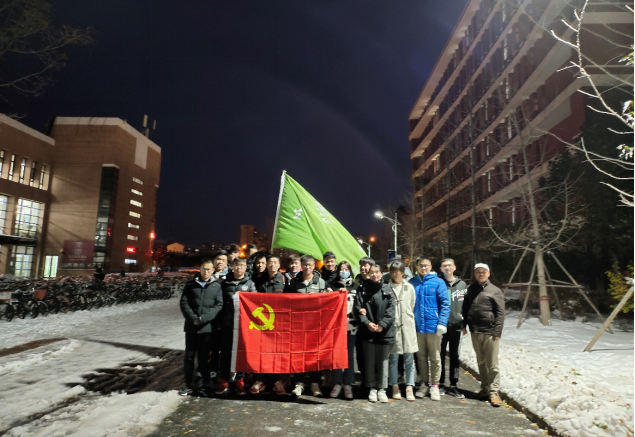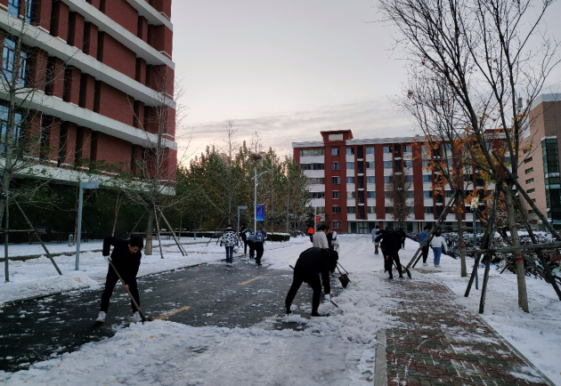 天仪楼北侧道路是员工党支部扫雪除冰的重点路段,这里连接员工宿舍、员工食堂和教学楼,是同学们每天学习生活的必经之路。志愿者们分工明确、配合默契,积雪结冰的湿滑路面恢复了往日干净整洁的模样。党旗红、生态绿、飞雪白,三种颜色交相辉映,呈现出一道美丽的风景线。