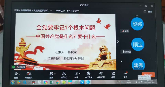 首先由韩秋莹同志就“中国共产党是什么?要干什么?”领学了本次党课学习,以强化理论武装、提高政治能力、推进自我革命、永葆初心使命为主线展开,然后其他同志就自己的学习发表心得。