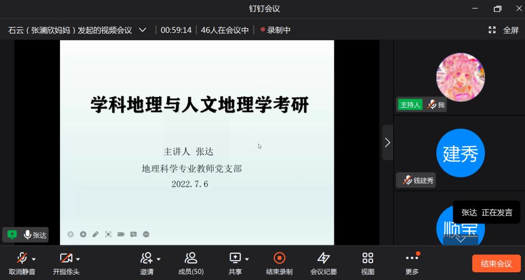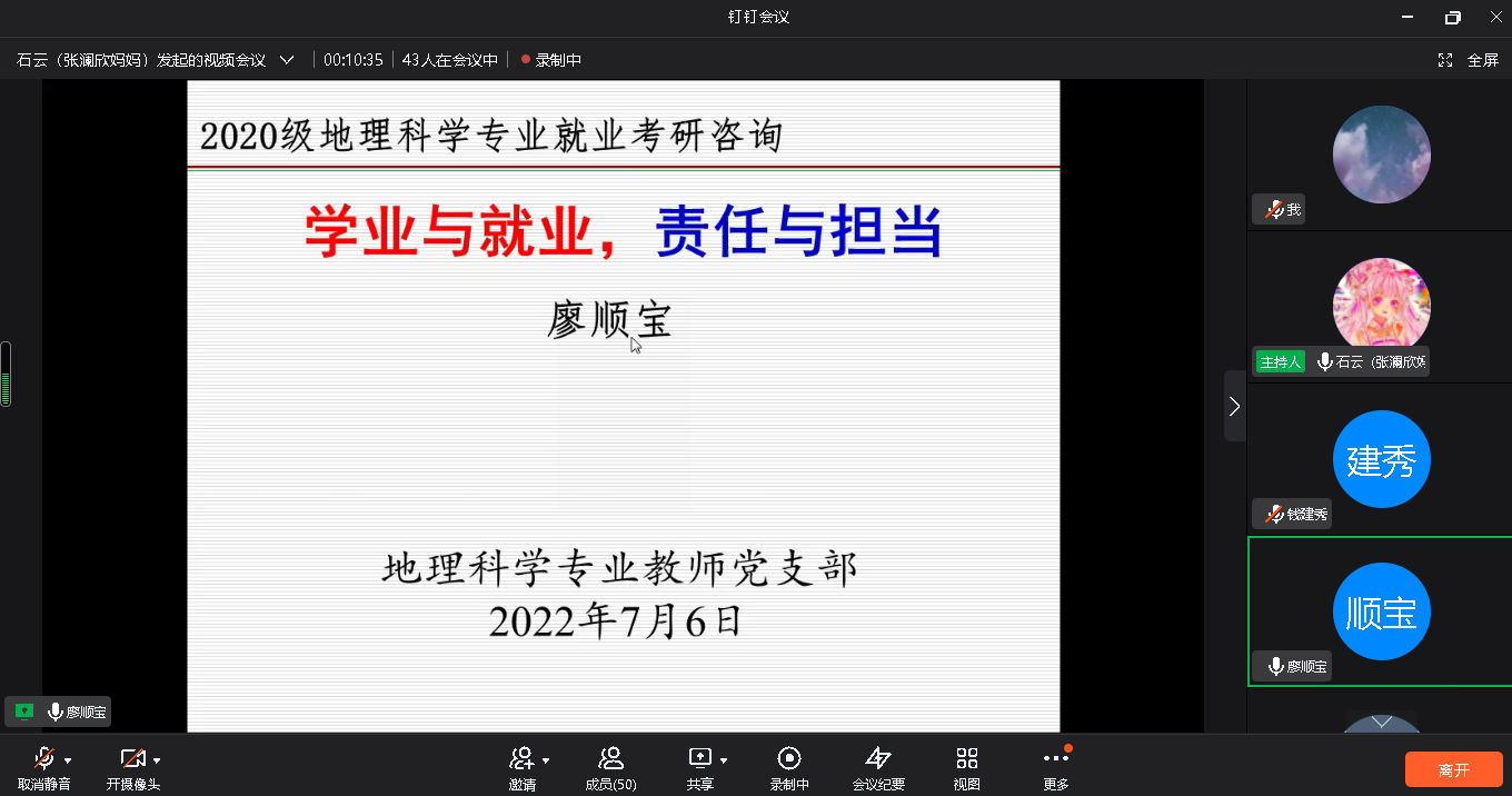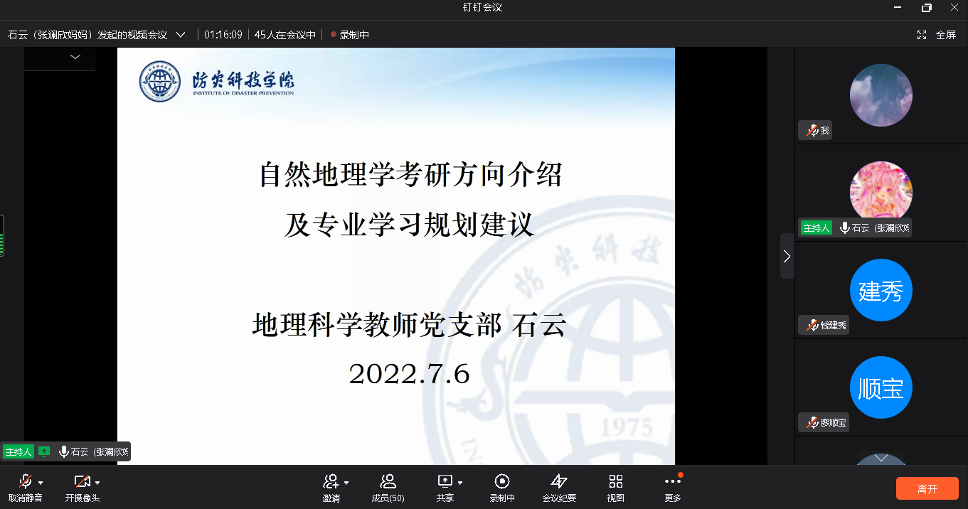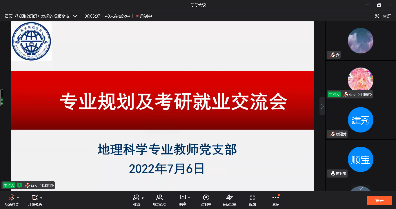 为让地理科学专业同学对专业考研和就业方向有更深入的认识,2022年7月6日上午,yl永利集团官网登录地理科学专业教师党支部开展了地理科学专业规划及考研就业交流会。会议采用钉钉群线上会议的形式,党支部书记石云同志主持本次交流会,地理科学专业教师党支部全体党员以及200211班全体同学参加了本次交流会。