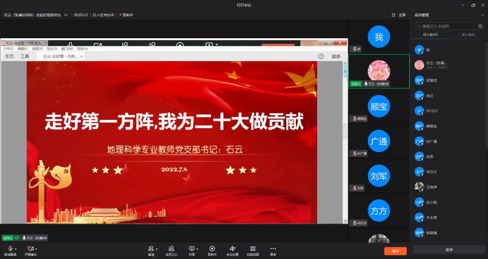 2022年7月8日,地理科学专业教师党支部和测绘工程专业教师党支部在钉钉会议群,联合开展以“走好第一方阵我为党的二十大作贡献”为主题的党支部书记讲党课。会议由石云同志主持。