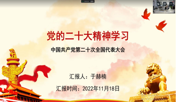 首先由于赫楠同志领学了“党的二十大精神学习”,从党的二十大召开的时代背景、党的二十大报告的核心要义、贯彻落实党的二十大精神三个方面展开。其他同志仔细聆听,认真学习,积极发表心得体会,并开展热烈讨论。