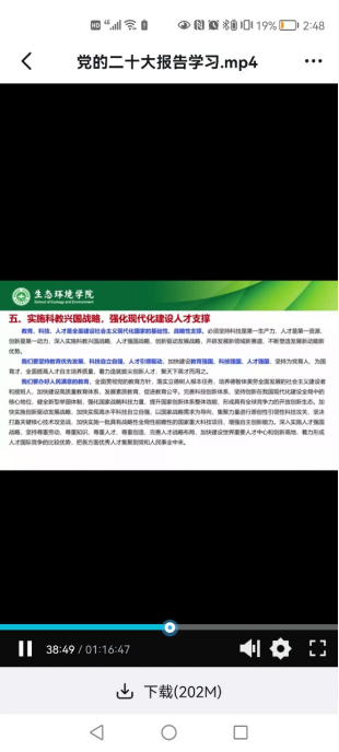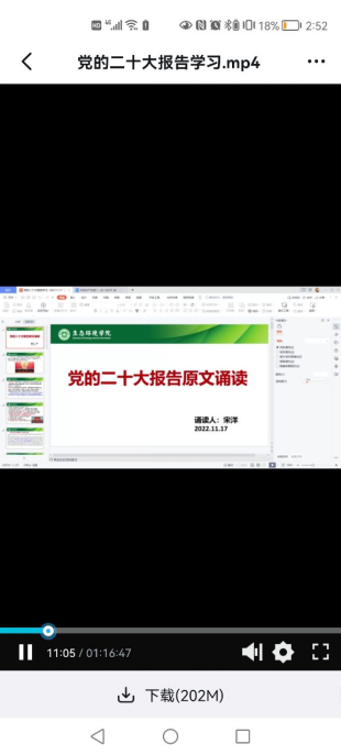 会议上,宋洋同志作为党的二十大报告的诵读人,介绍了本次大会的主题,从“过去五年的工作和新时代十年的伟大变革”、“开辟马克思主义中国化时代化新境界”等十五个部分对党的二十大报告进行了诵读,并强调了其中与我们关联较为密切的“实施科教兴国战略,强化现代化建设人才支撑”、“推动绿色发展,促进人与自然和谐共生”和“推进国家安全体系和能力现代化,坚决维护国家安全和社会稳定”三个部分。